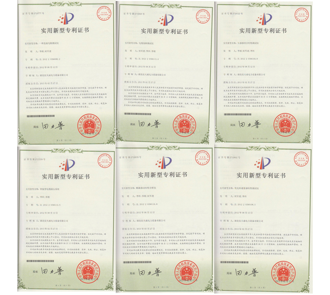 2013年2月,湖北儀天成電力設備有限公司自主研發(fā)的直流電阻測試儀、互感器綜合特性測試儀、電纜故障測試儀、智能型電纜耐壓系統(tǒng)、斷路器動特性分析儀、氧化鋅避雷器特性分析儀共6種產品再榮獲國家知識產權局頒發(fā)的實用新型專利證書。