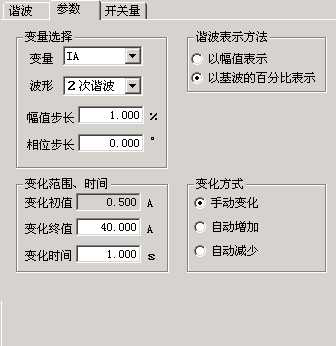 幅值步長:這里的步長也與“諧波表示方法”相對應(yīng)。當(dāng)選擇“以幅值表示”時,步長也以幅值表示,單位是A或V;而選擇“以基波的百分比表示”時,則步長也是百分比。