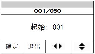 打印之前您需要設(shè)置需打印數(shù)據(jù)的起始序號和結(jié)束序號,使用“”鍵在序號的各位之間切換,使用“”鍵改變各位的數(shù)字大小,設(shè)置完成后按“確定”鍵確認(rèn)。