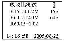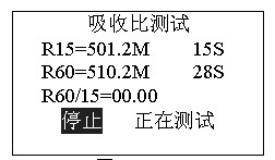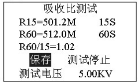 正在測(cè)試,若想停止測(cè)試,按確認(rèn)鍵停止測(cè)試。吸收比測(cè)試完畢后自動(dòng)計(jì)算比值,進(jìn)入是否保存提示。