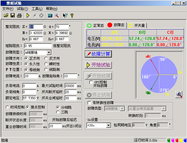 以上只設(shè)置了相應(yīng)的短路阻抗,如果再告訴軟件一定的故障電流,軟件將自動計算出相應(yīng)的故障電壓,由測試儀輸出相應(yīng)的故障電壓和電流給保護。設(shè)置的故障電流應(yīng)滿足以下要求:1、大于保護的啟動電流;2、故障電流與短路阻抗的乘積應(yīng)不大于57.7V。