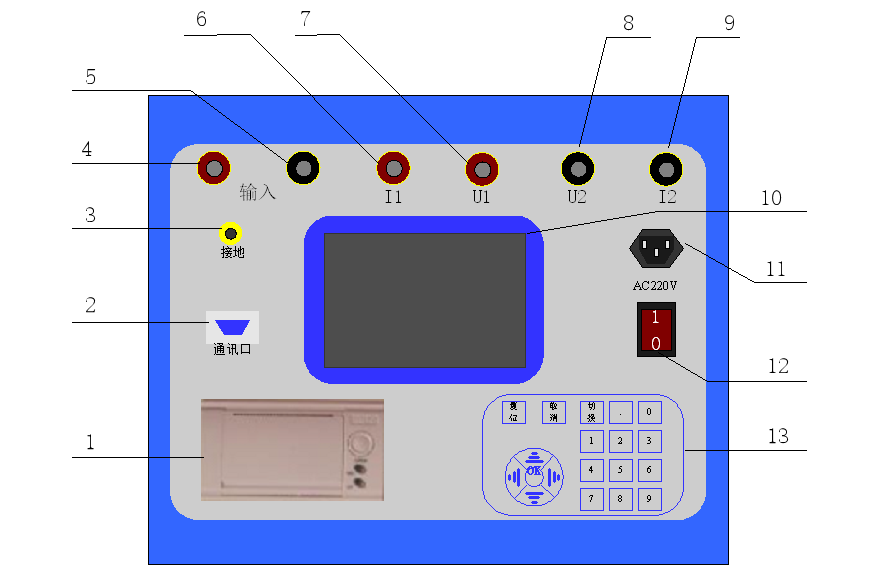 12)儀器工作電源開關(guān);                                              13)數(shù)字鍵盤,非常便于輸入。