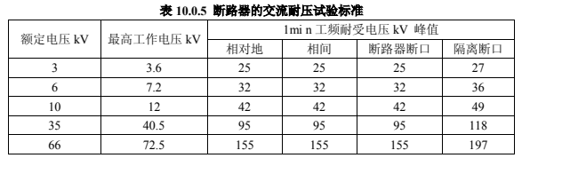 斷路器的交流耐壓試驗(yàn)應(yīng)在分、合閘狀態(tài)下分別進(jìn)行,試驗(yàn)電壓按照表 10.0.5 規(guī)定執(zhí)行。