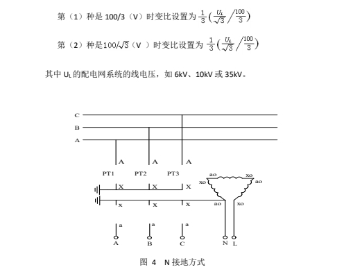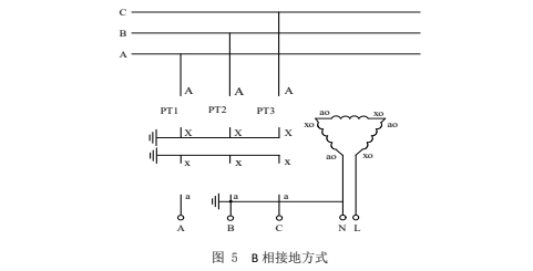 這種接線方式分“N 接地”、“B 相接地”兩種,分別如圖 4 和圖 5 所示。對(duì)于這兩種方式,均從 N-L 兩端注入測(cè)試信號(hào)。根據(jù)所用 PT 的不同,組成開口三角的二次繞組。