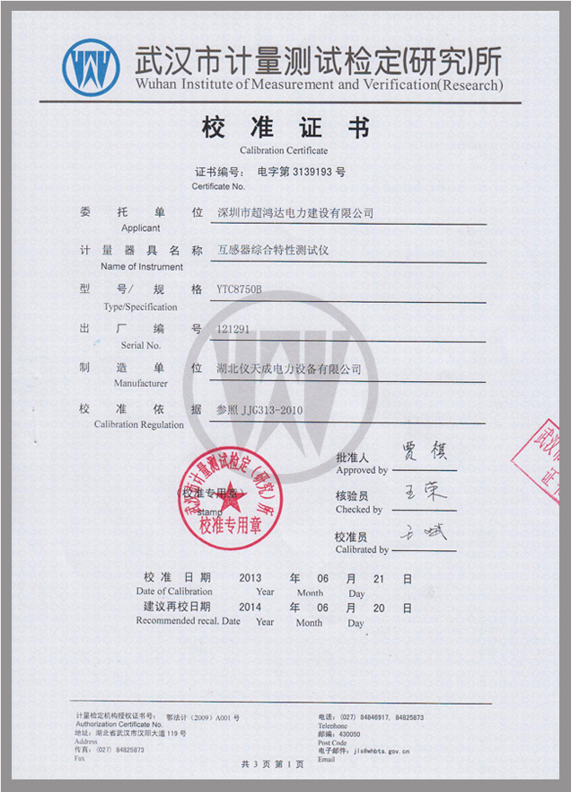 YTC8750B互感器伏安變比極性綜合測(cè)試儀鑒定證書(shū)